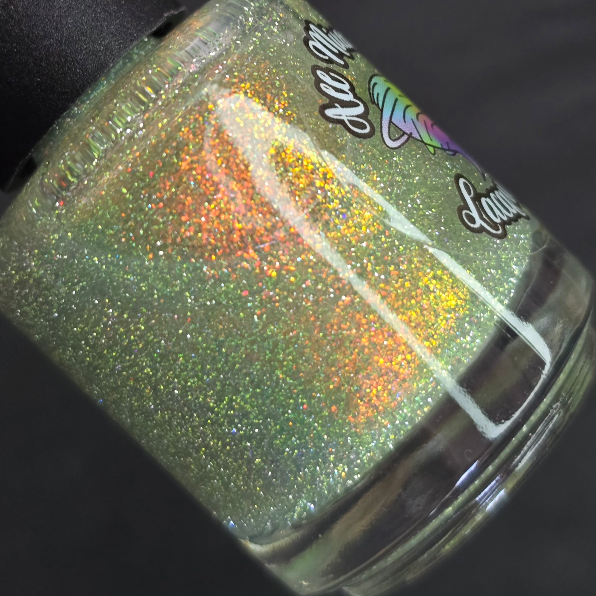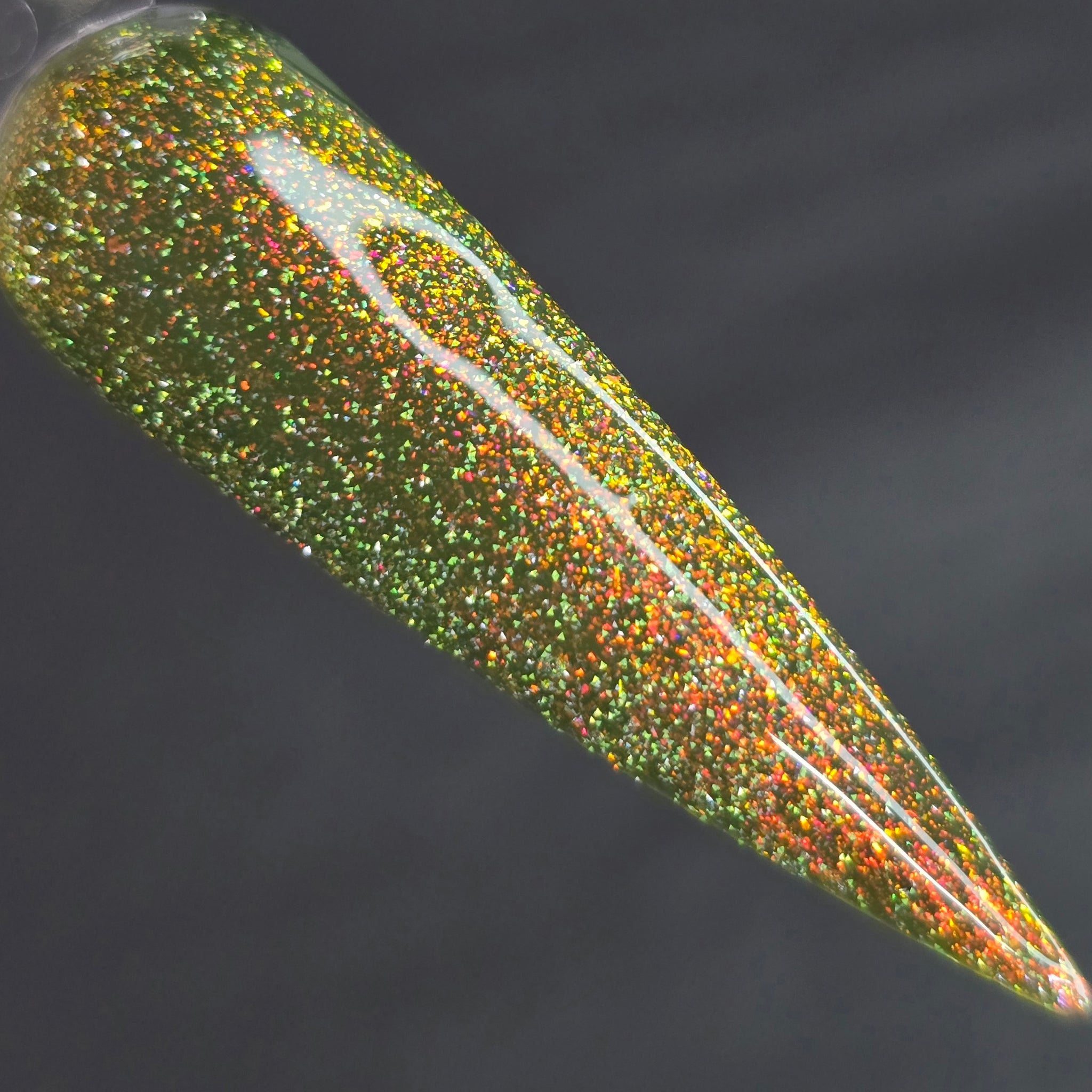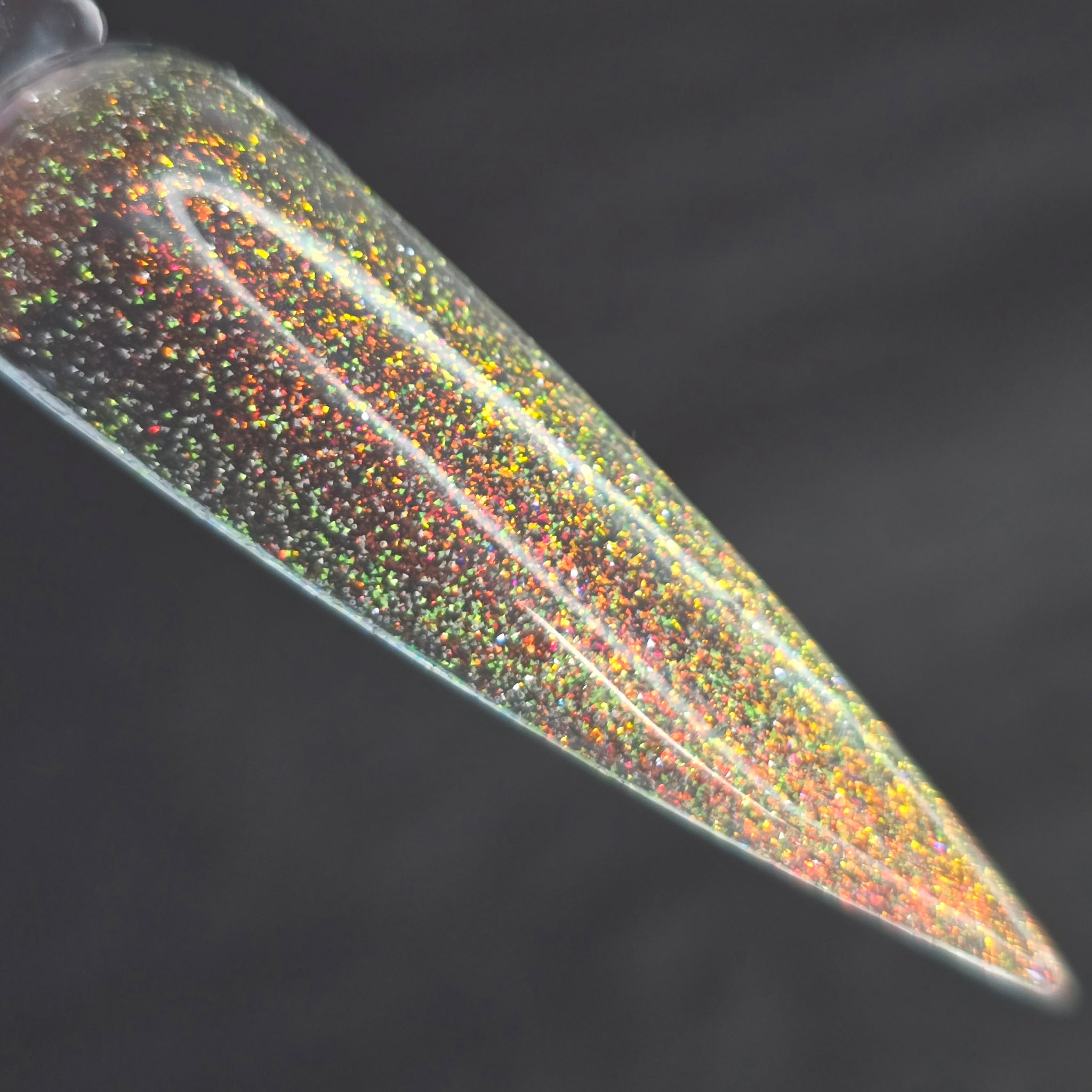 "Charm School Dropout" a topper with red/gold shifting shimmer and reflective glitters.