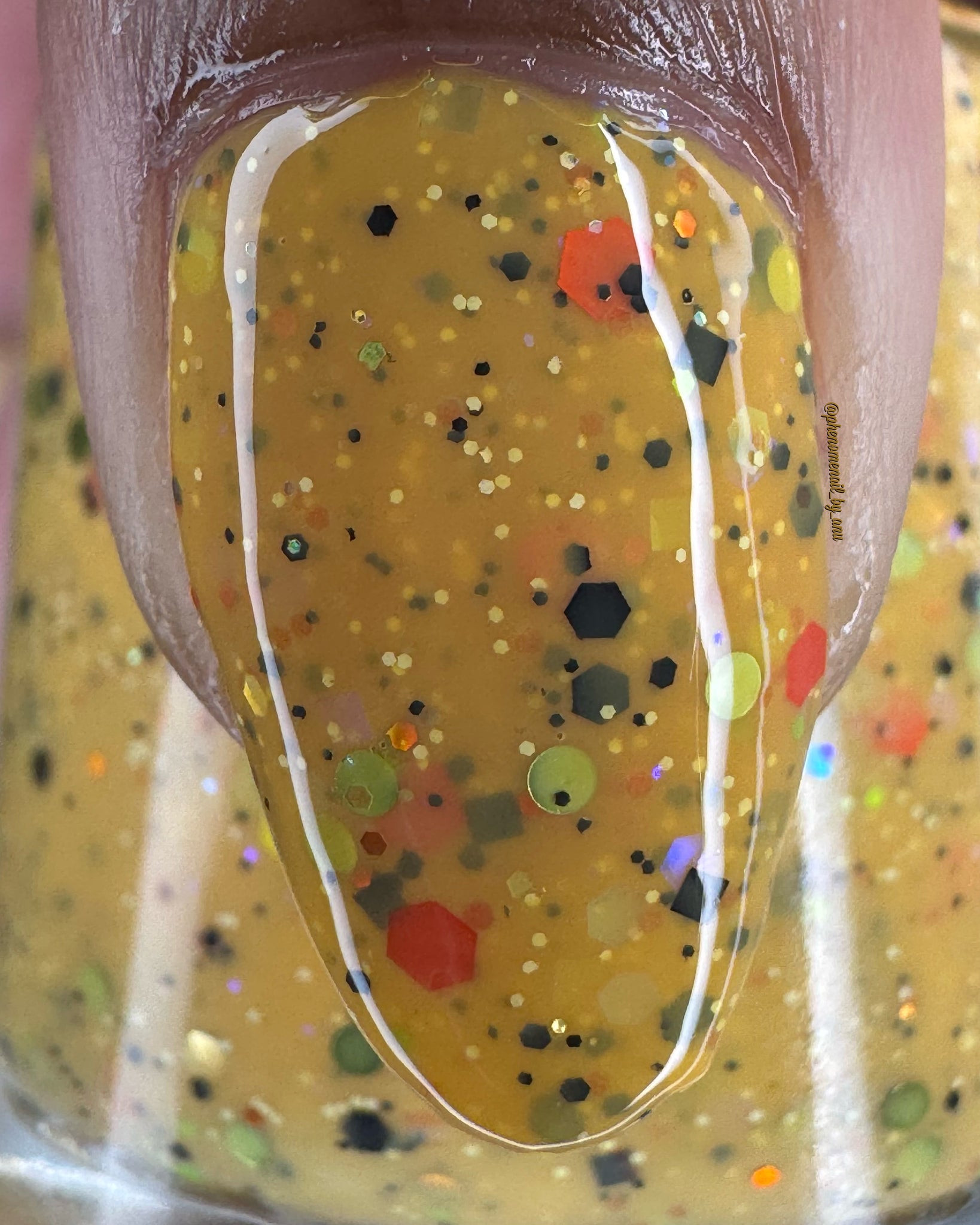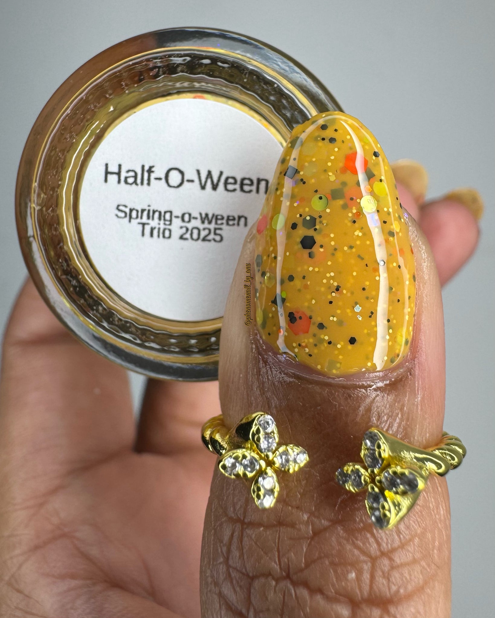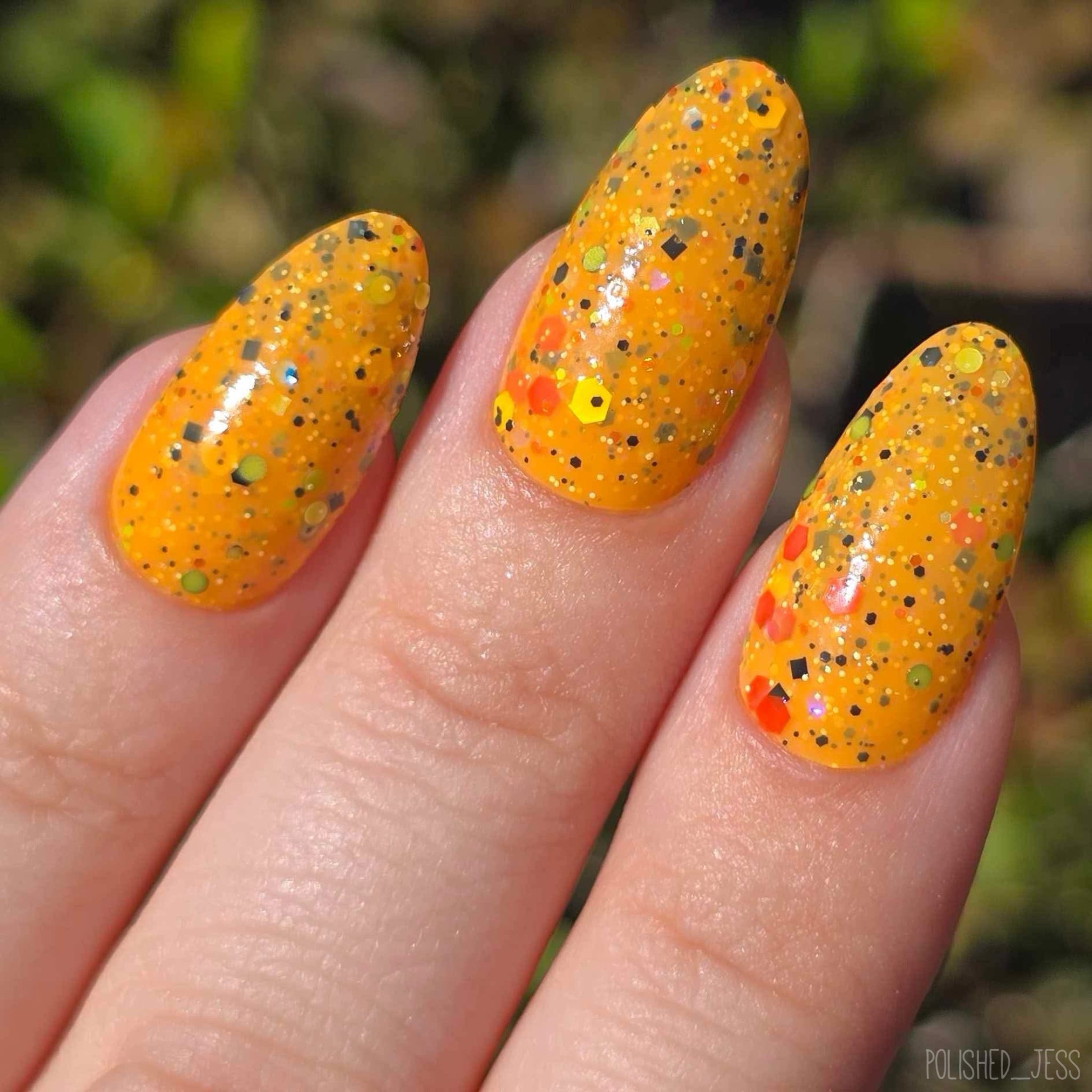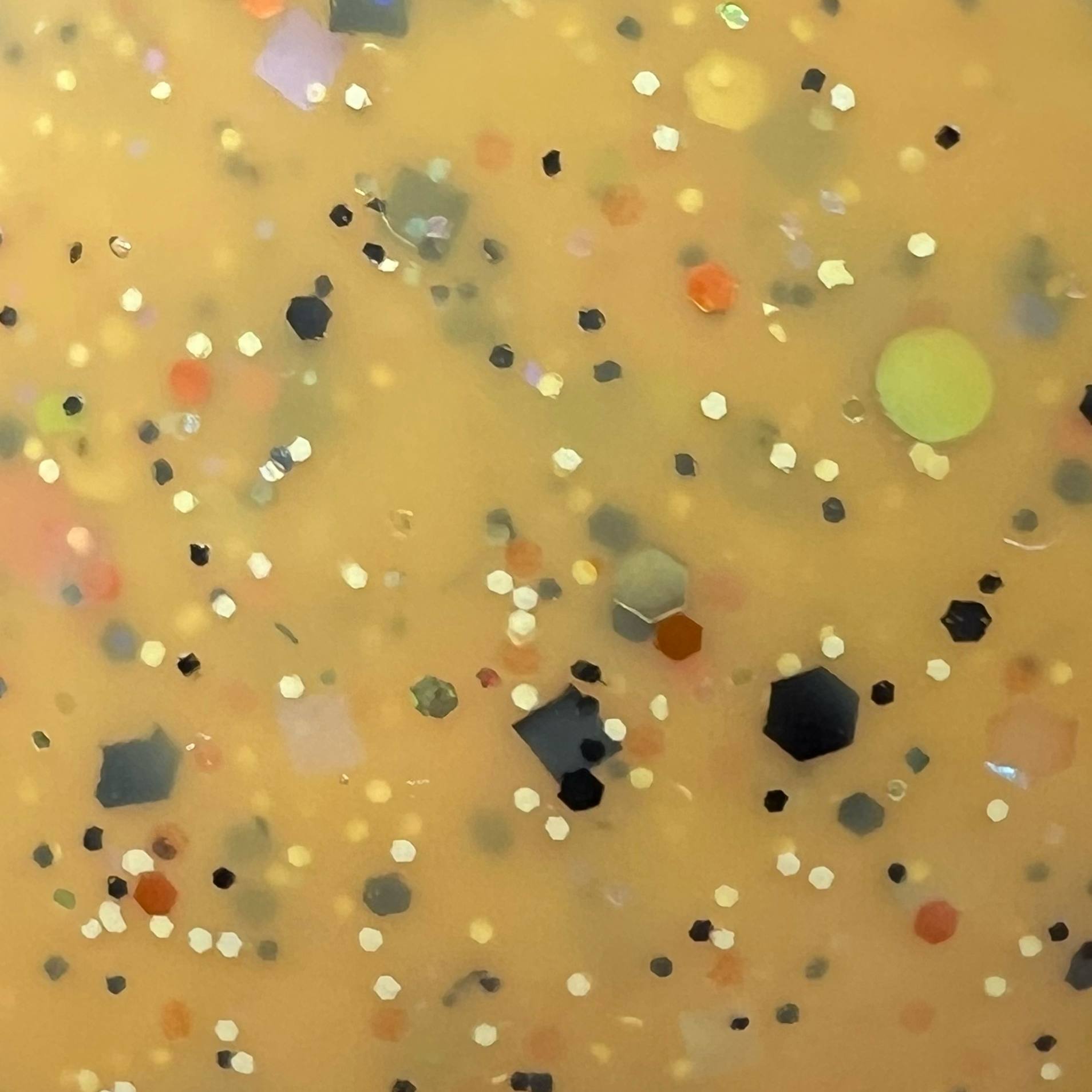 “Half-O-Ween” is a fun light orange crelly loaded with black, orange, white, gold and iridescent glitters in different sizes and shapes.