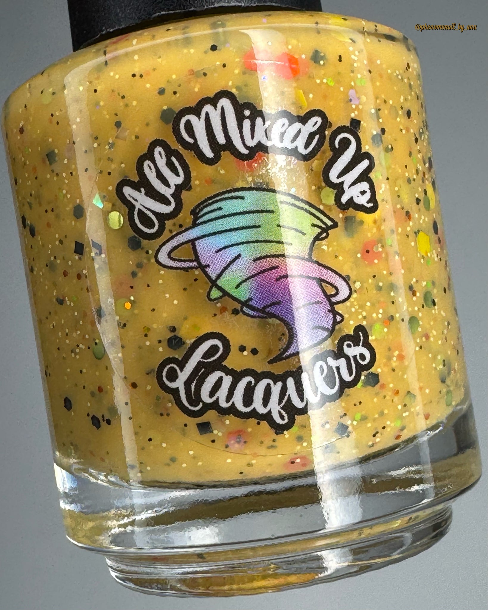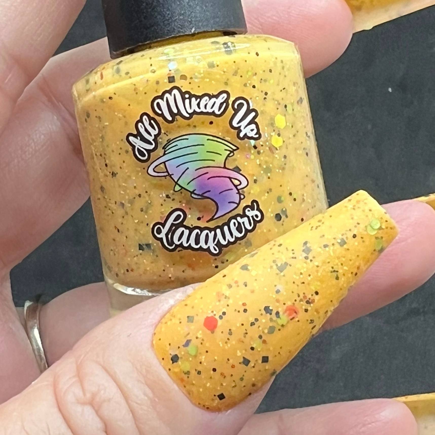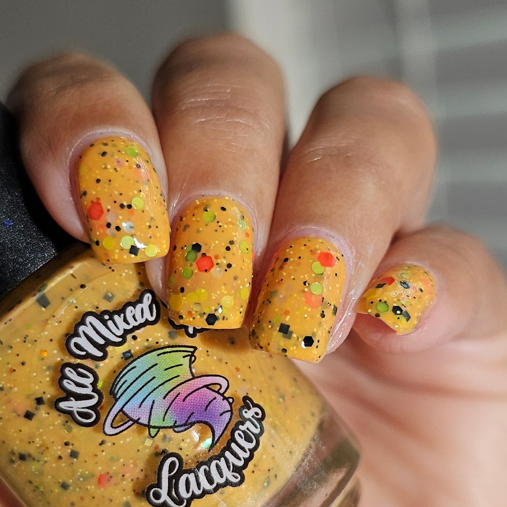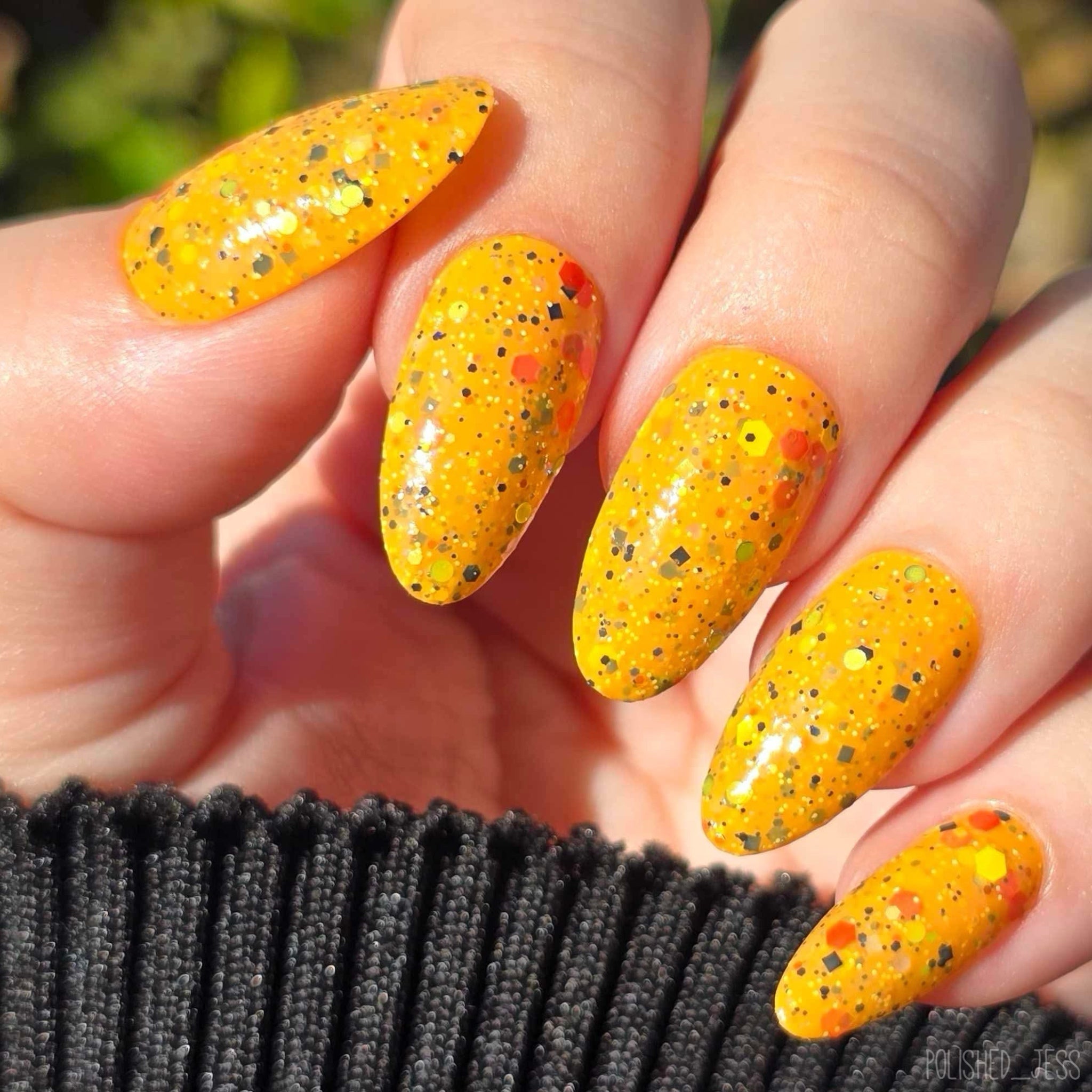 “Half-O-Ween” is a fun light orange crelly loaded with black, orange, white, gold and iridescent glitters in different sizes and shapes.