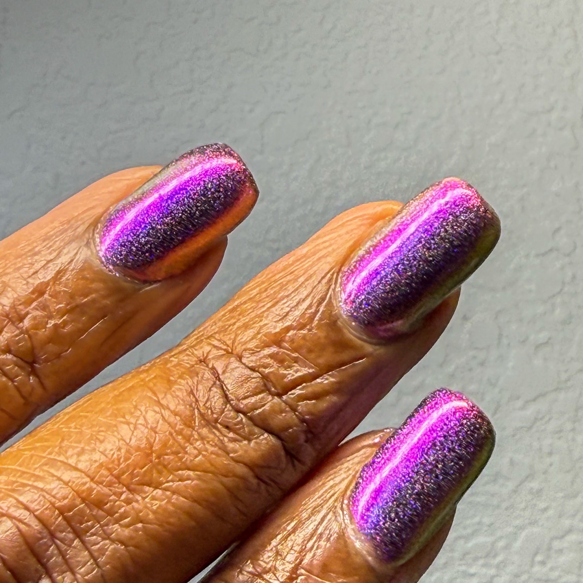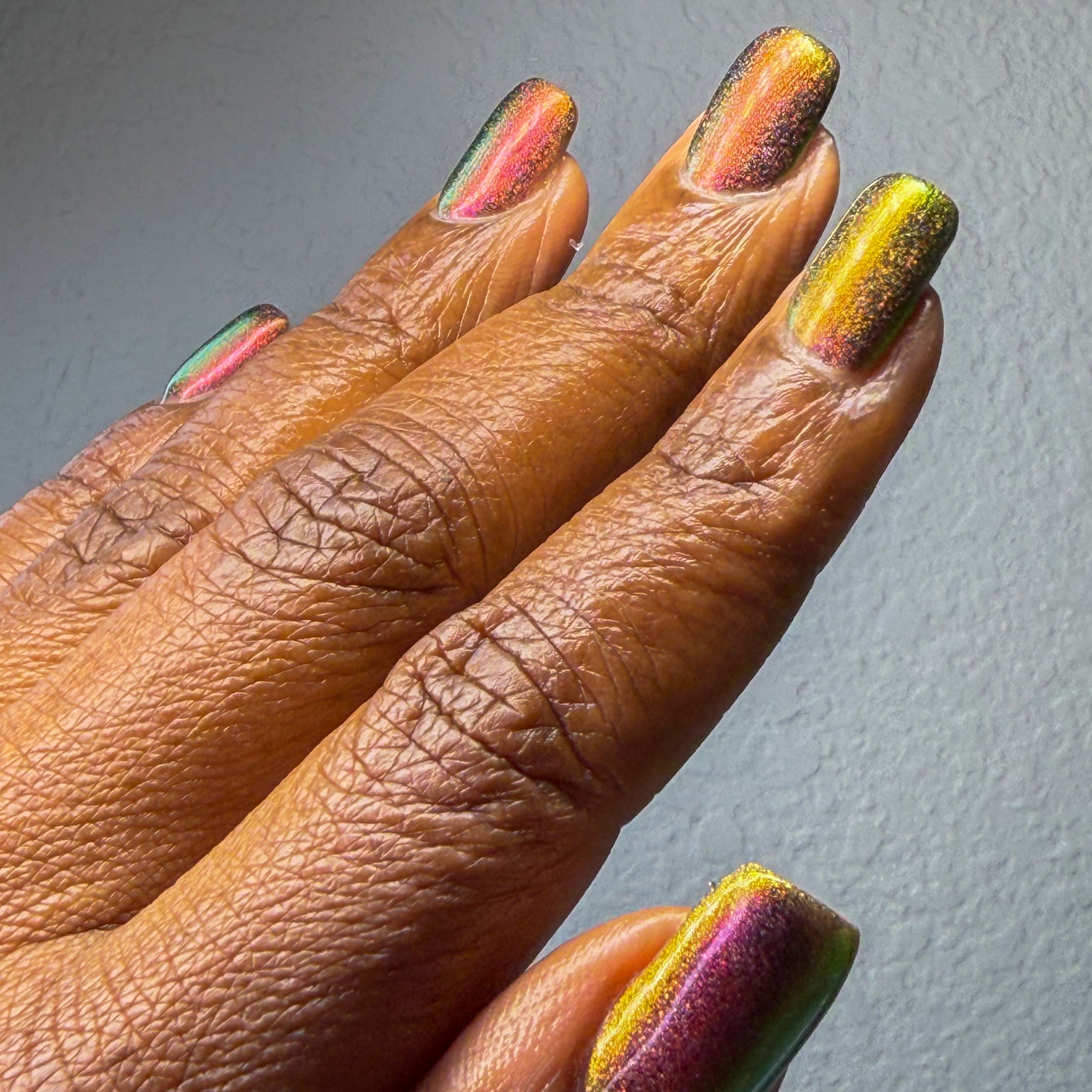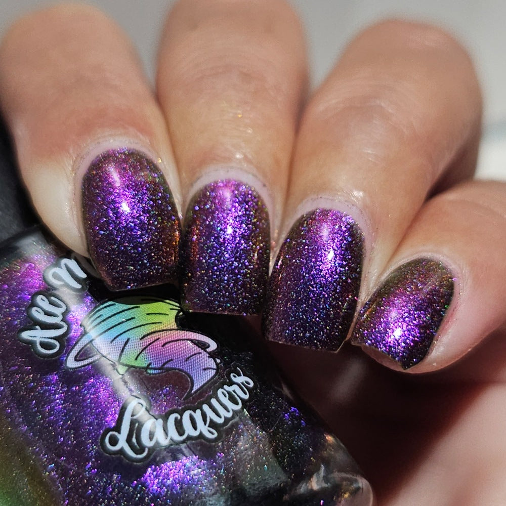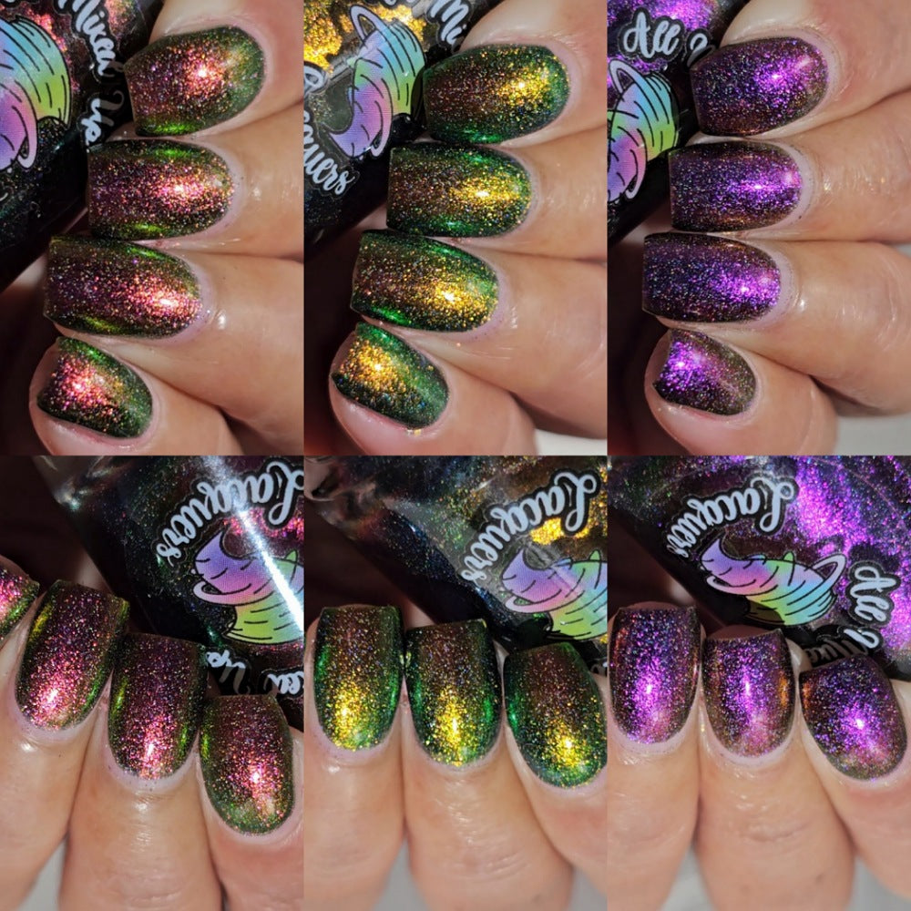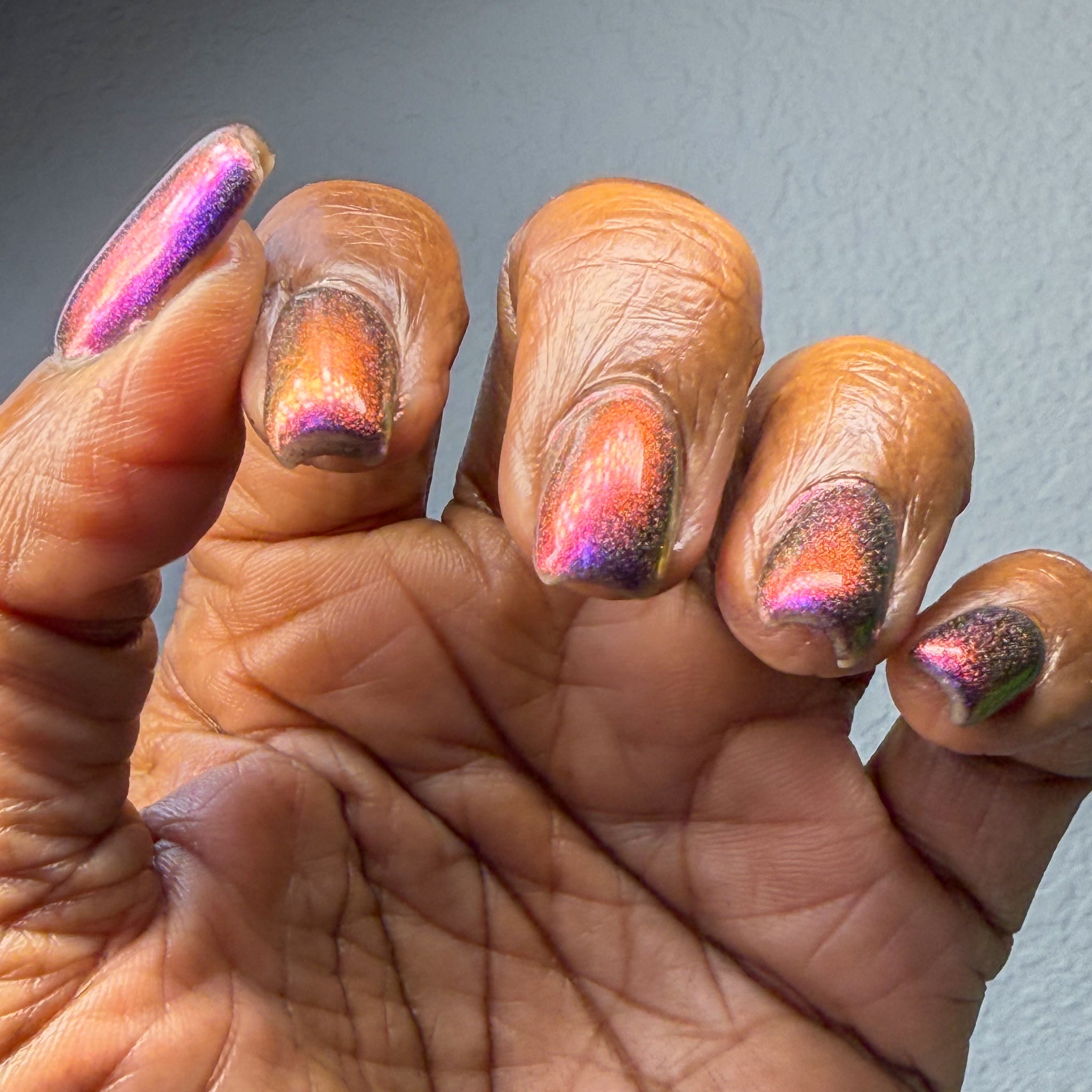 “Bite Me” - scattered holographic multichrome with a fuchsia/copper/green shift