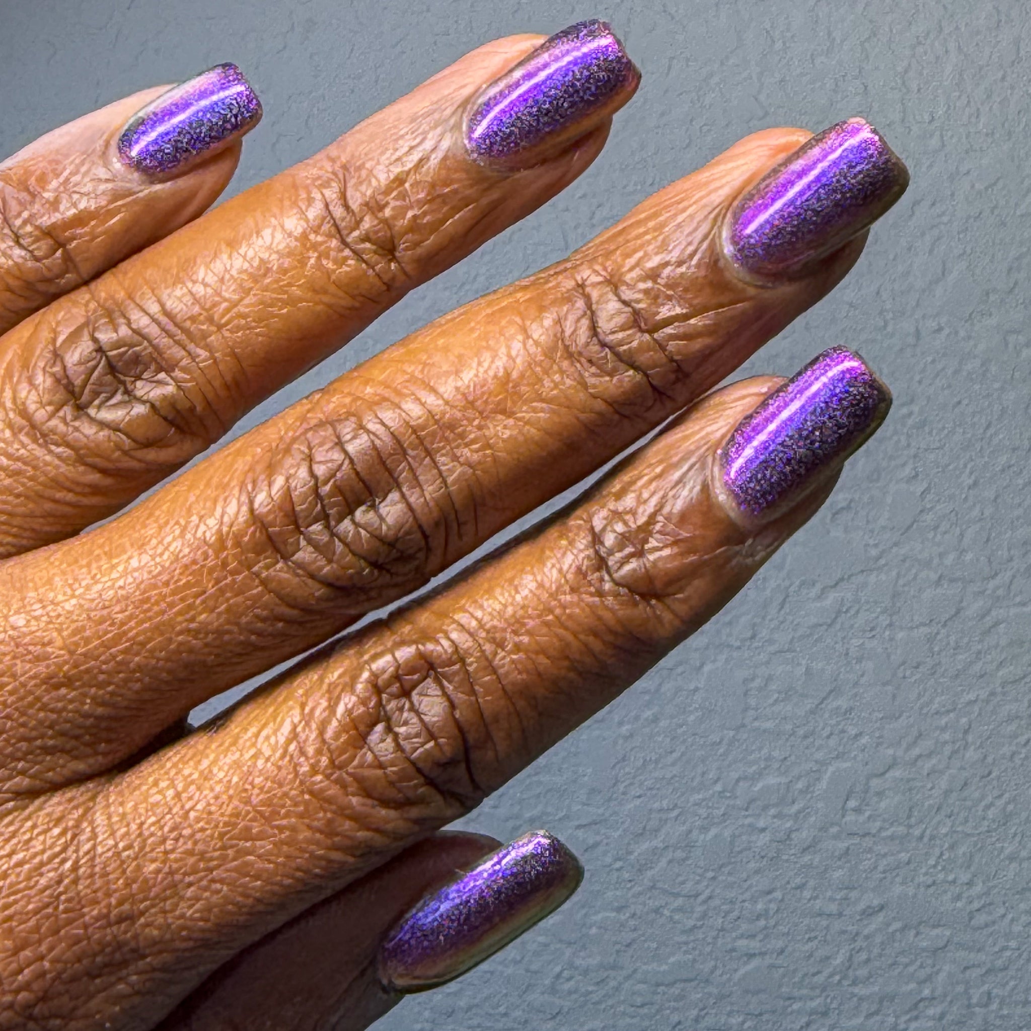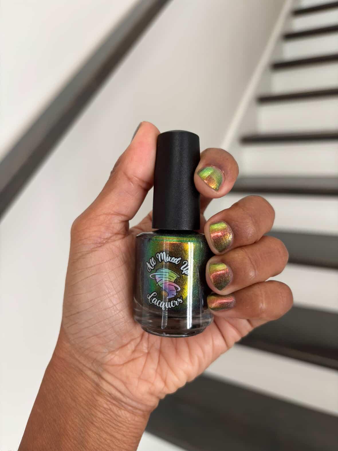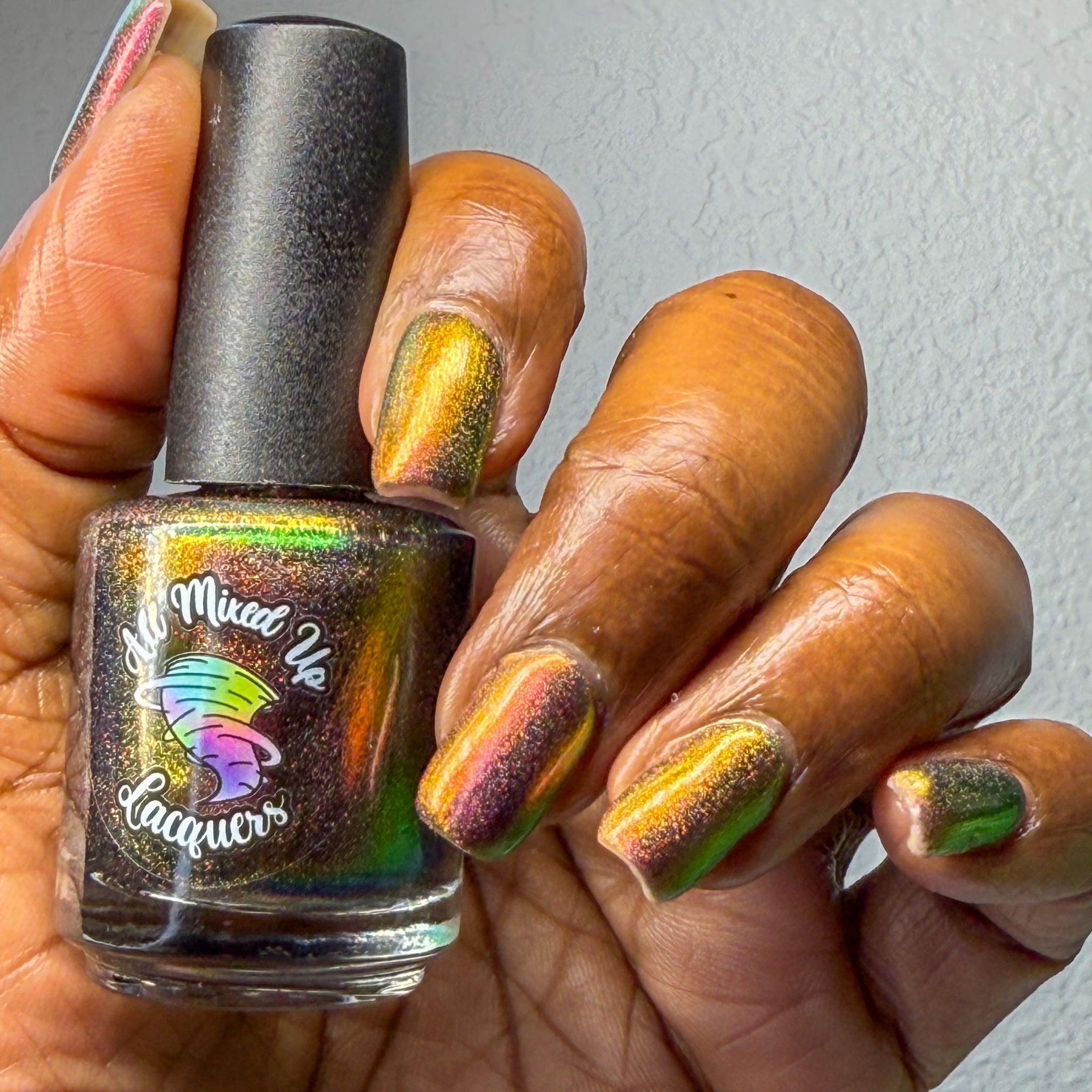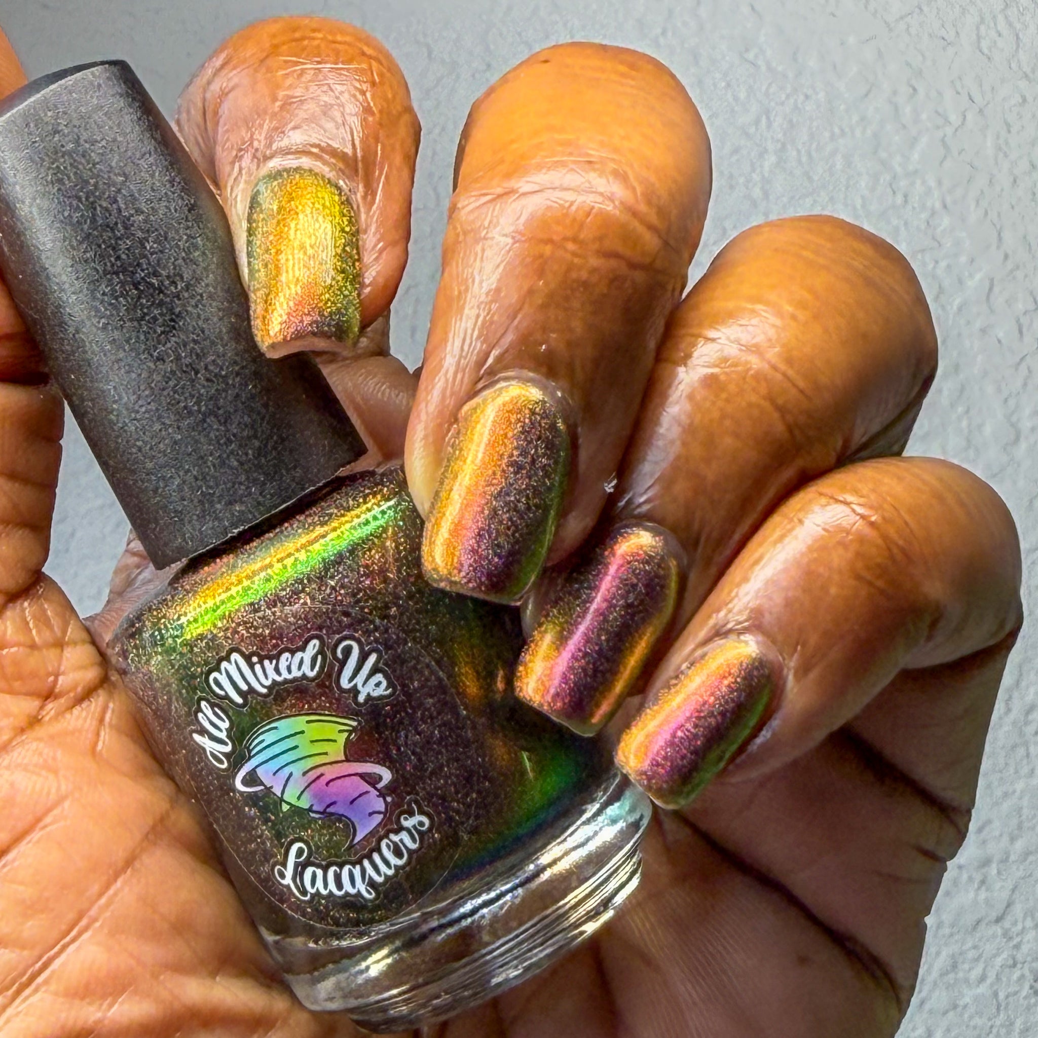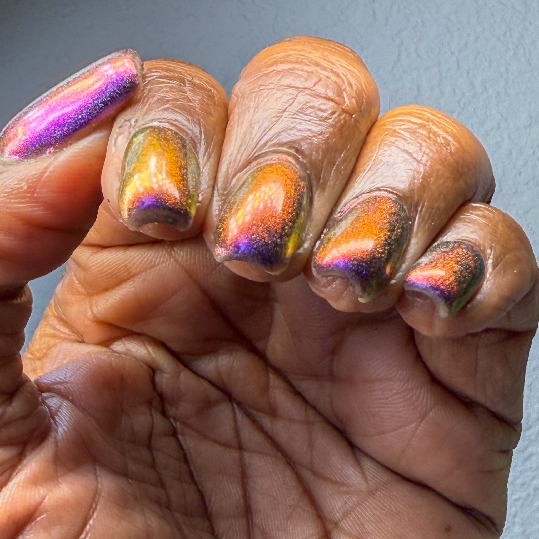 “Rust in Peace” - a scattered holographic multichrome with a copper/gold/green shift.