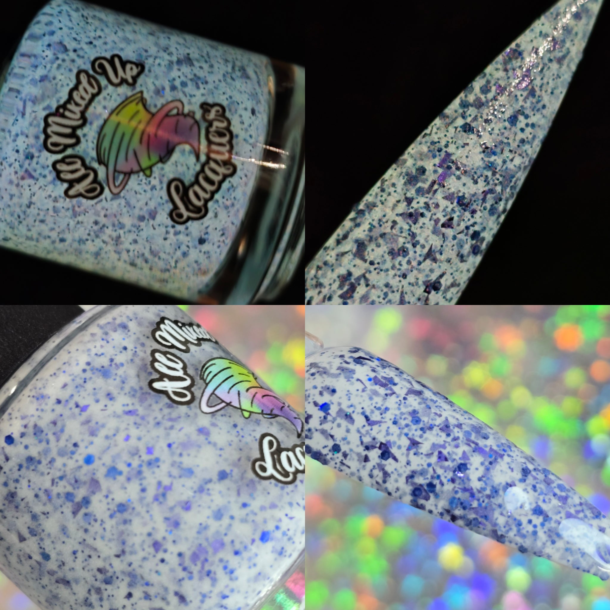 "Werewolf" is a white base that glows a whitish hue in the dark with assorted navy glitters