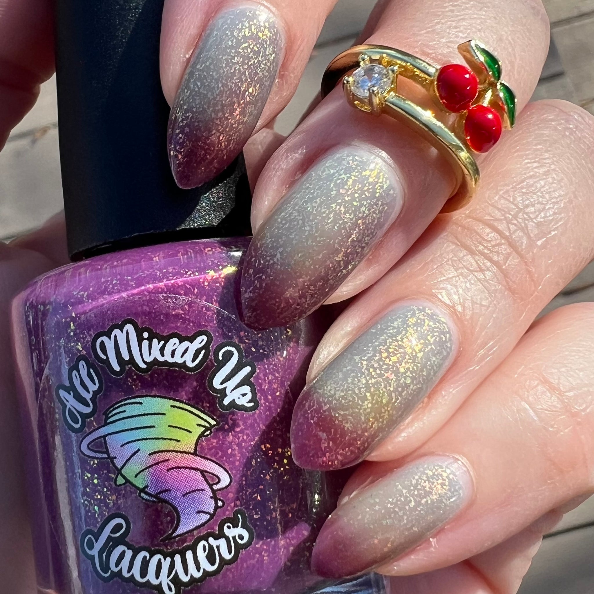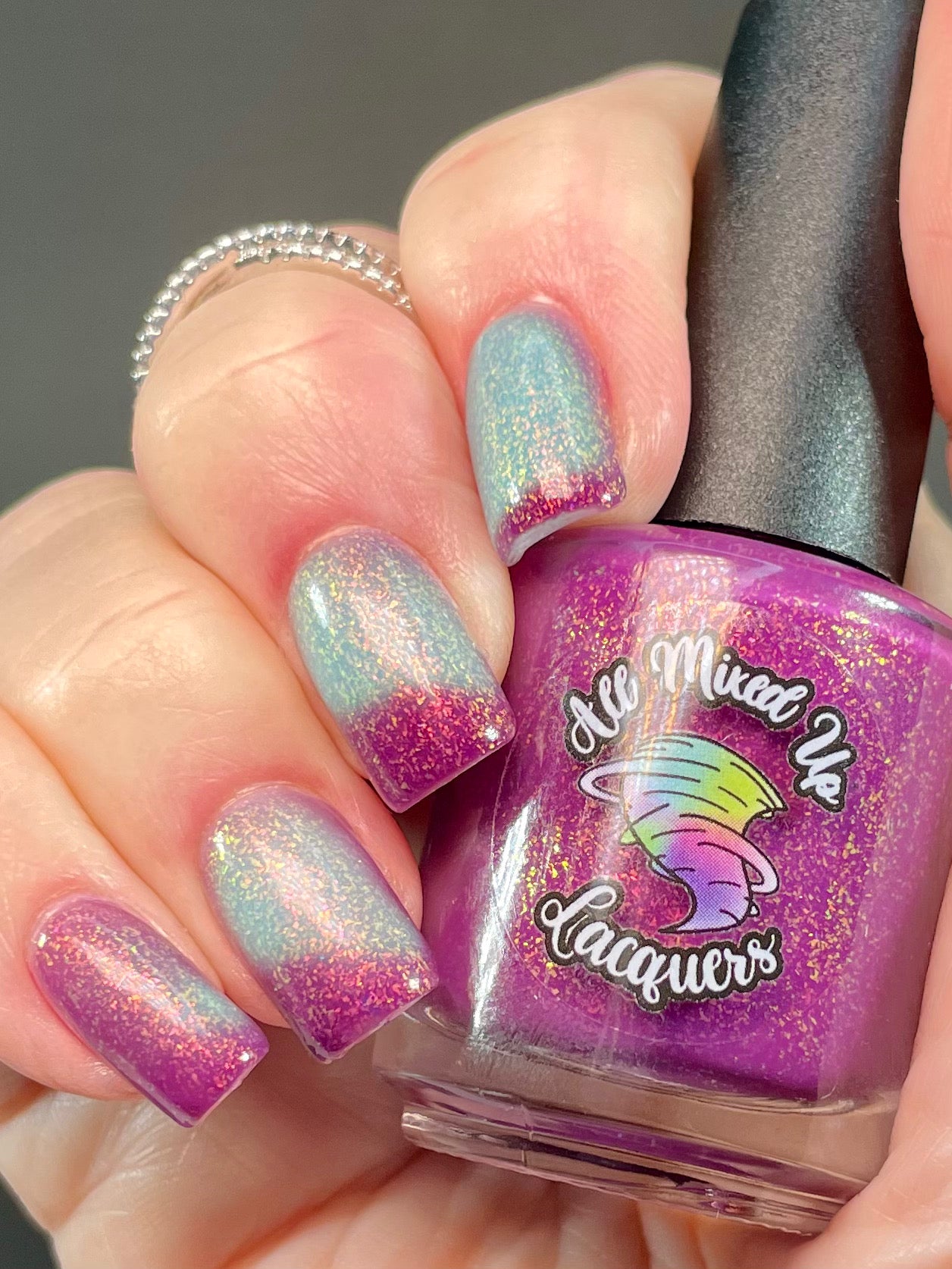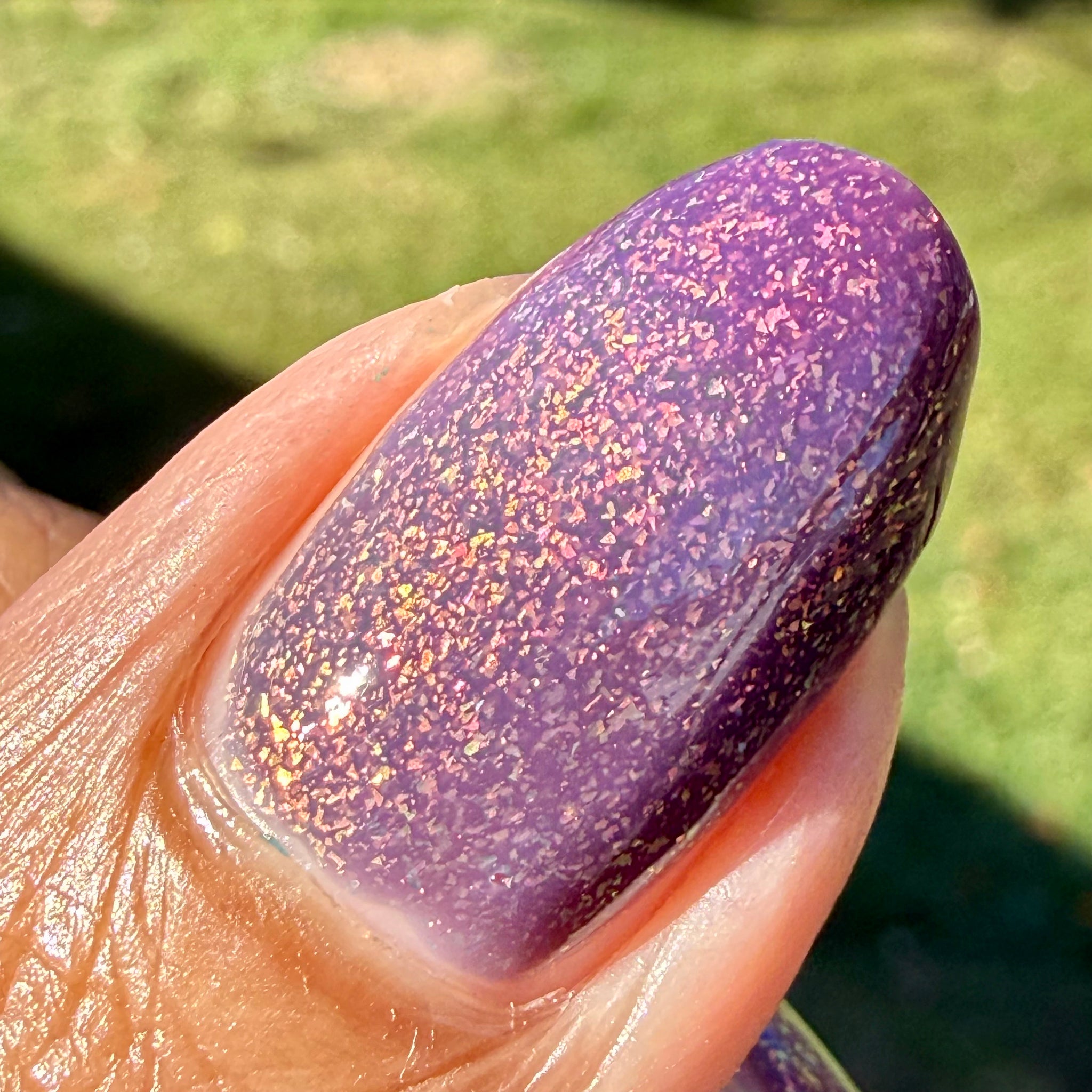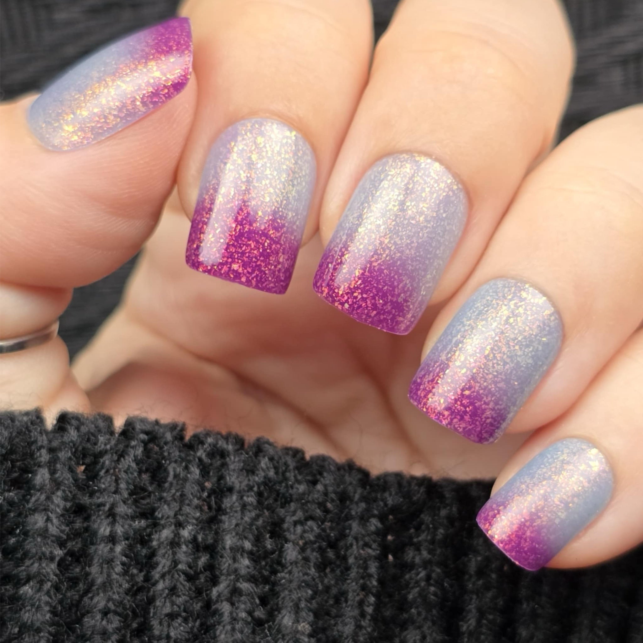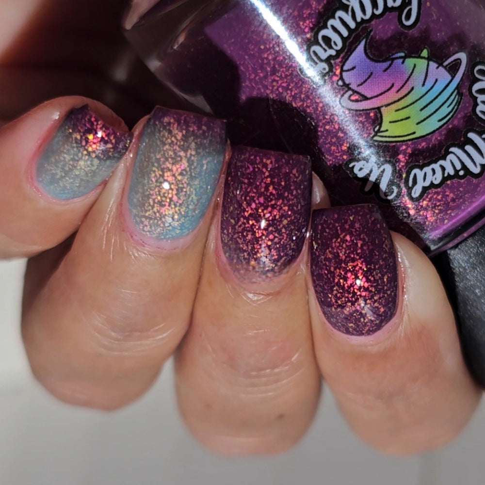 “Not Today Asshole” - a thermal shifting from berry (when cold) to a light sky blue (when warm) with large pink/gold shifting flakes